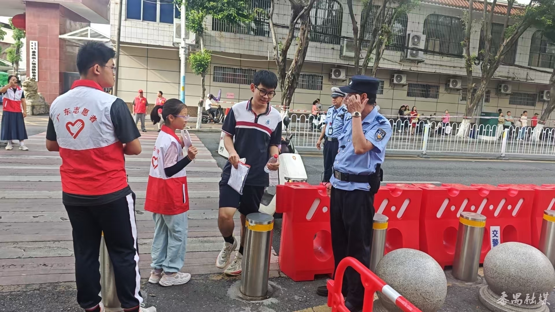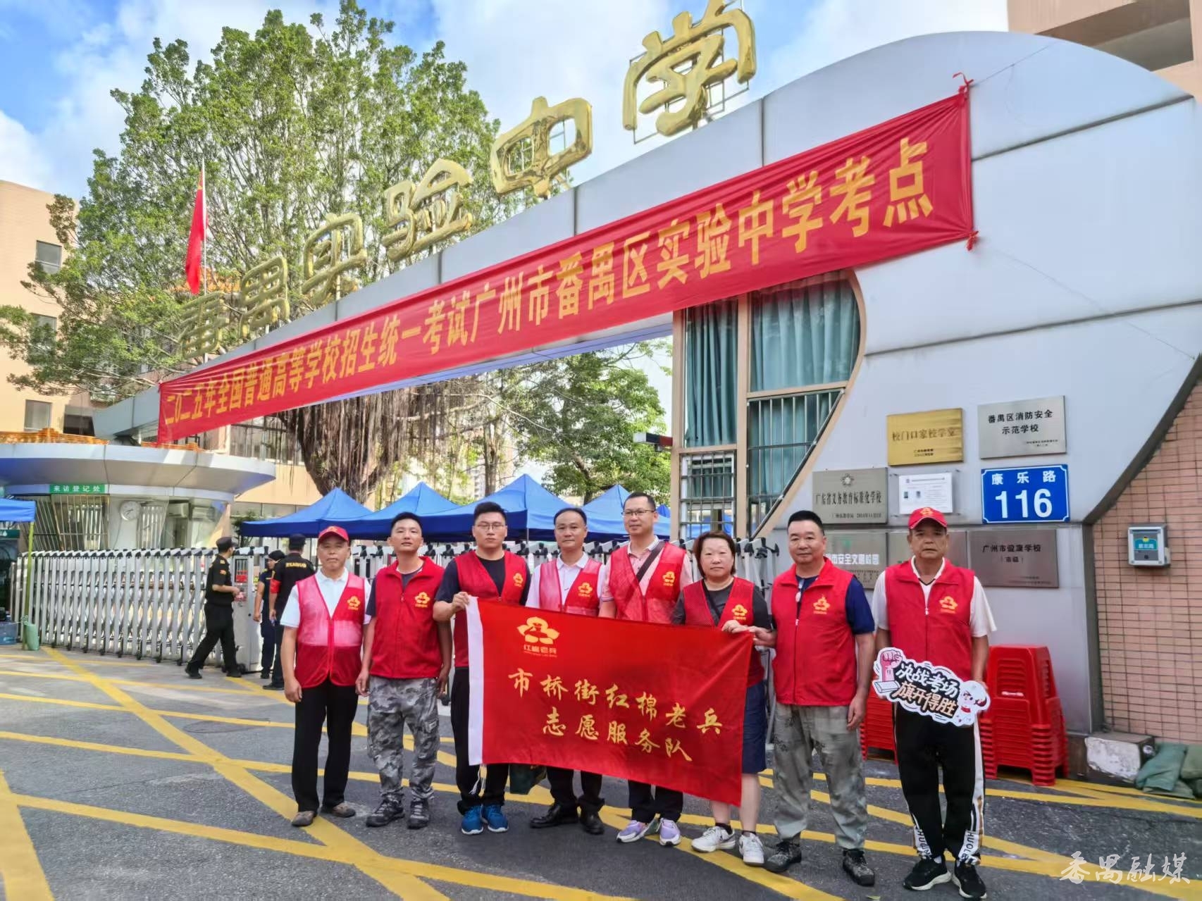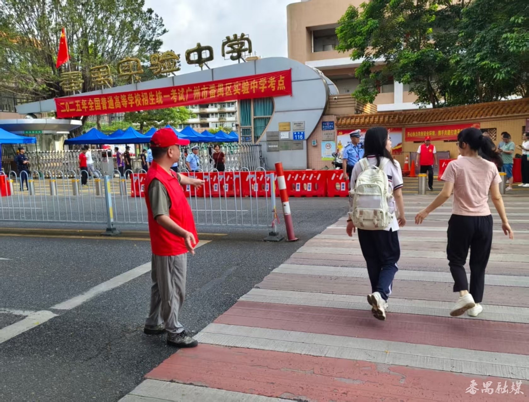 与此同时,由十余名退役军人组成的红棉老兵志愿服务队,也早早到达考点,协助开展志愿服务工作。他们身着统一红色马甲,分为多个小组,有的协助交警疏导校门口交通,避免影响考生通行;有的在入场通道指引考生快速安检;有的为焦急等候的家长指引休息区、发放饮用水,并耐心安抚情绪;有的则为现场考生加油助威、送去最真挚的祝福……